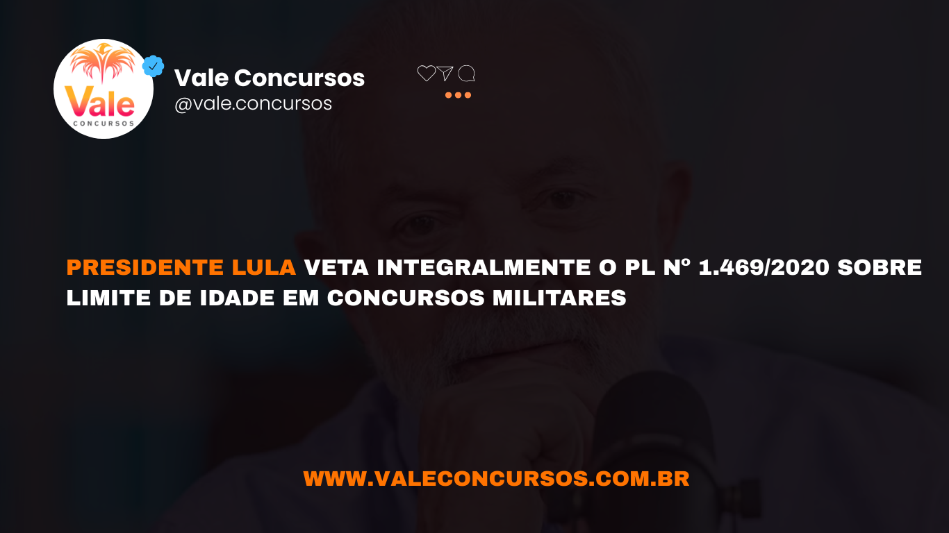 O presidente da República, Lula, vetou integralmente o Projeto de Lei nº 1.469/2020, que tratava da fixação de limite máximo de idade para ingresso nos concursos das Polícias Militares e