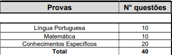 A prova escrita terá duração de 2 horas, composta por 40 questões de múltipla escolha, com 4 alternativas cada.