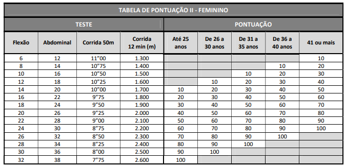 O TAF tem como objetivo avaliar a capacidade física do candidato e será composto pelos seguintes testes: