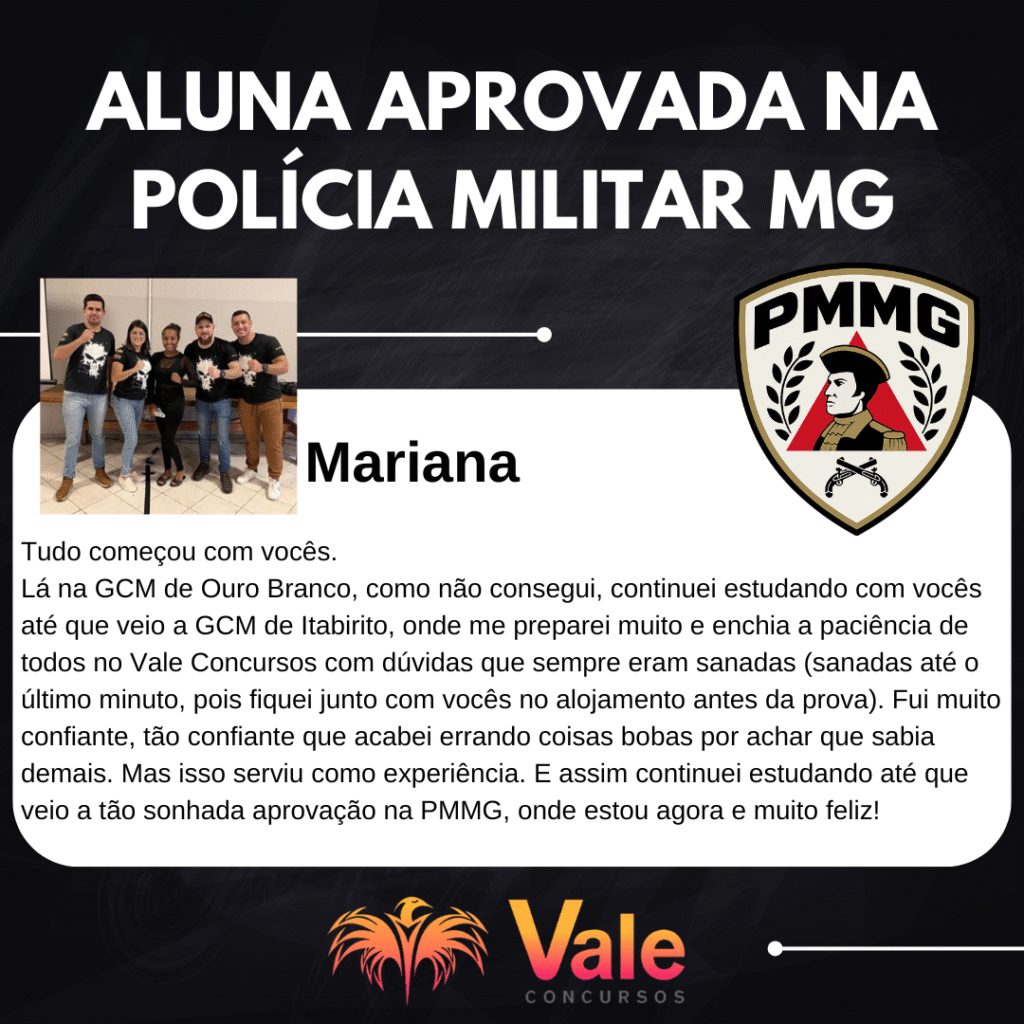 Aprovado na Polícia Militar MG – 2022 “Sempre tive o desejo de ser Policial Militar já estava na Polícia Penal como contratado e quando procurei um material de qualidade eu encontrei o vale concursos”