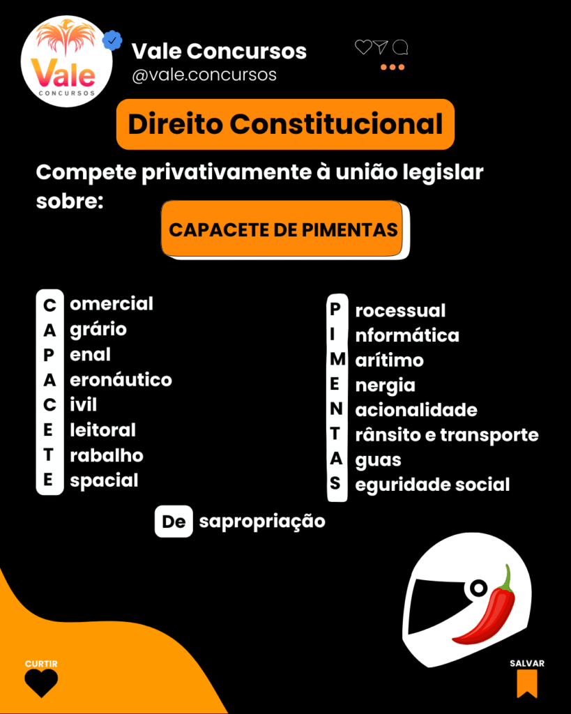 Para facilitar a memorização, utilizamos o famoso mnemônico “Capacete de Pimentas”, que ajuda a lembrar os principais assuntos previstos no art. 22 da Constituição Federal.