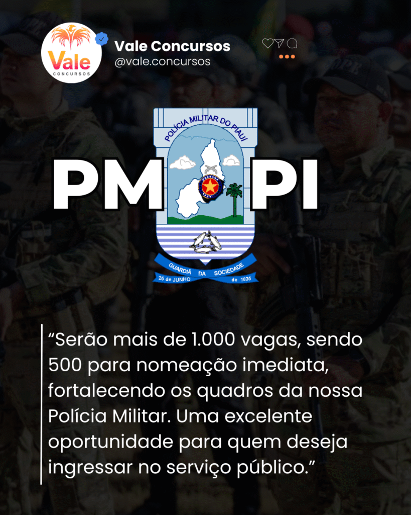 “Trata-se de uma excelente notícia para a segurança pública do nosso estado. Estou autorizando hoje o concurso da Polícia Militar do Piauí, com mais de 1.000 vagas, sendo 500 para ingresso imediato. É uma grande oportunidade para quem deseja iniciar uma carreira no serviço público estadual.”